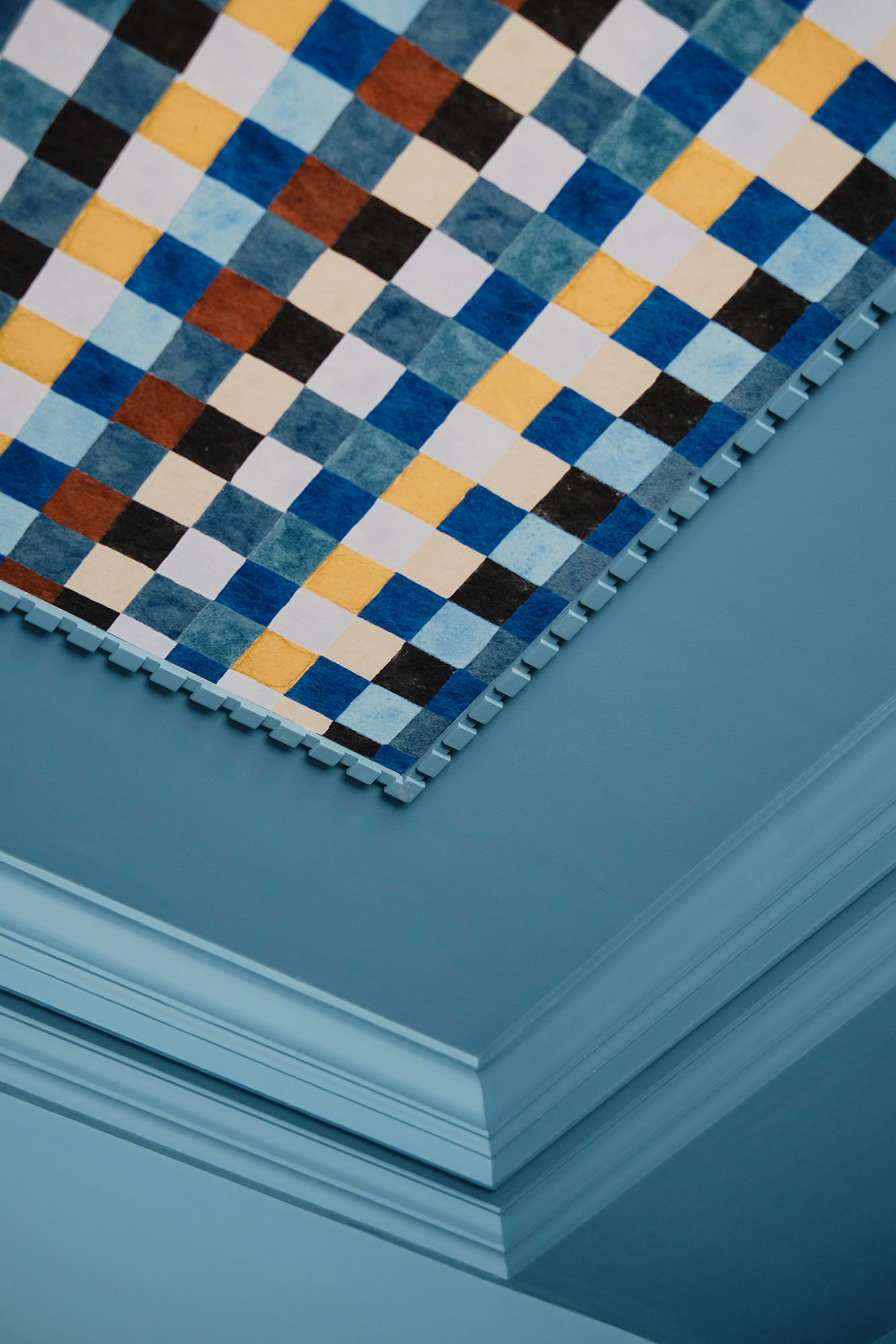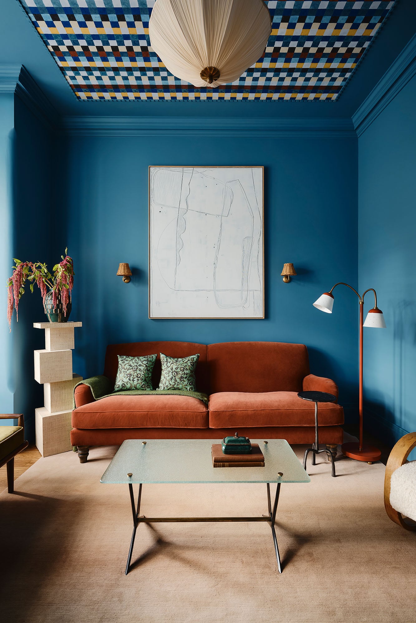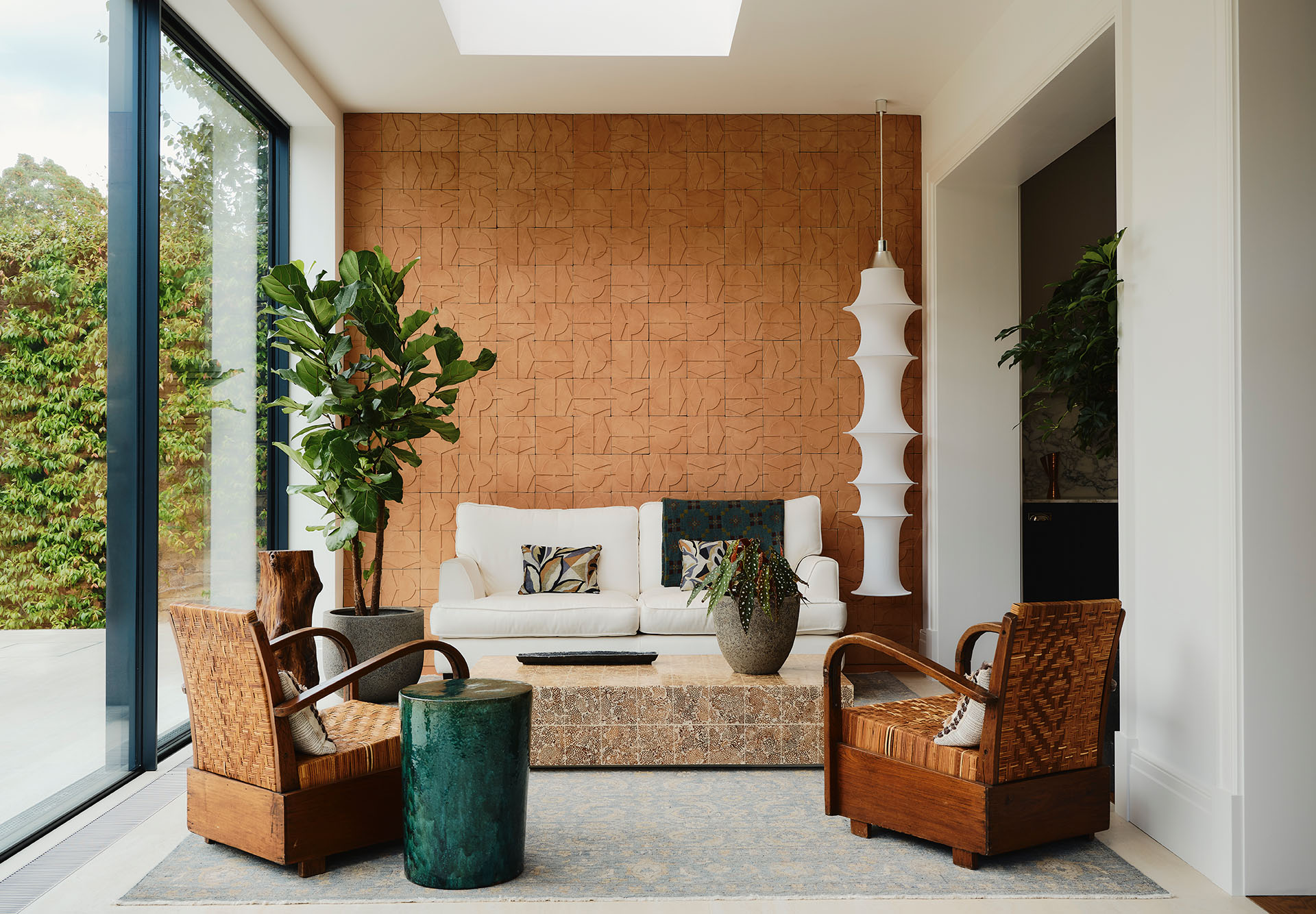 A deep blue snug, with Christopher Farr ceiling wallpaper framed by ornate cornicing, offers a cocooning retreat. The orangery, reimagined as a light-filled everyday space, glows with Italian terracotta tiles by Cristina Celestino for Fornace Brioni, laid seamlessly to echo the home’s brick exterior.