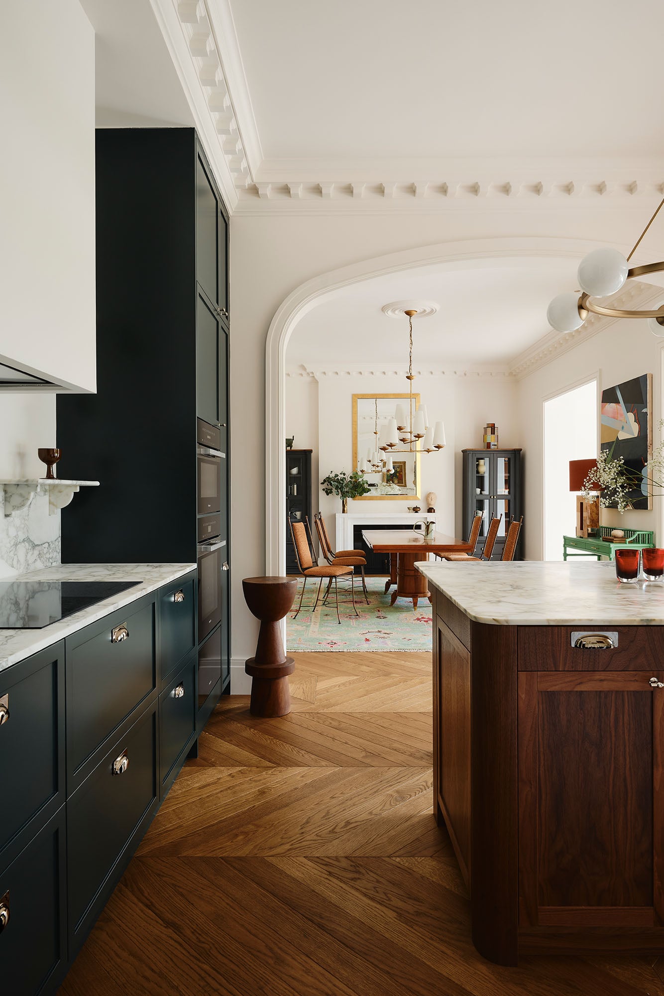 The kitchen, finished in Little Greene’s Obsidian Green 216 with Arabescato Verde marble, is centred on a bespoke island and large arched opening that enhances connectivity.